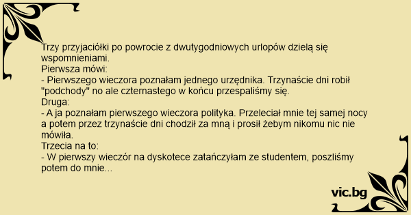 - W pierwszy wieczór na dyskotece zatańczyłam ze studentem, poszliśmy potem do mnie zakosztować trochę seksu i kiedy czternastego dnia wyszedł z łóżka i otworzył okno to tylko krzyknął - "O ku**a, to tu jest morze!"