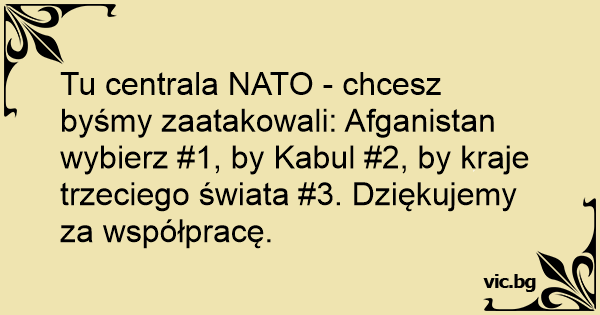 Tu centrala NATO - chcesz byśmy zaatakowali: Afganistan wybierz #1, by Kabul #2, by kraje trzeciego świata #3. Dziękujemy za współpracę.