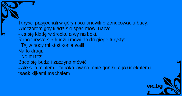 Turyści przyjechali w góry i postanowili przenocować u bacy. Wieczorem gdy kładą się spać mówi Baca: