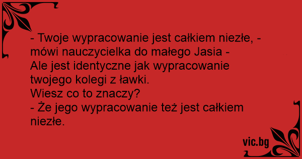 - Twoje wypracowanie jest całkiem niezłe, - mówi nauczycielka do małego Jasia -