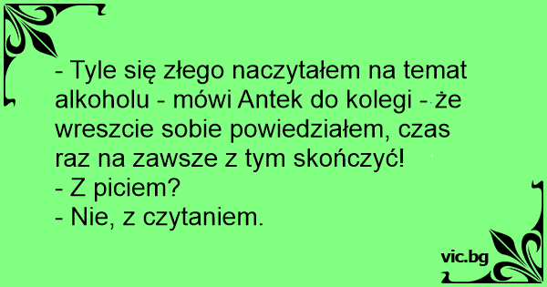- Tyle się złego naczytałem na temat alkoholu - mówi Antek do kolegi - że wreszcie sobie powiedziałem, czas raz na zawsze z tym skończyć!