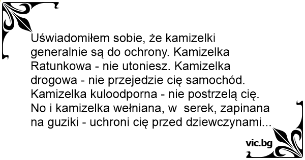 Ratunkowa - nie utoniesz. Kamizelka drogowa - nie przejedzie cię samochód. Kamizelka kuloodporna - nie postrzelą cię. No i kamizelka wełniana, w serek, zapinana na guziki - uchroni cię przed dziewczynami...