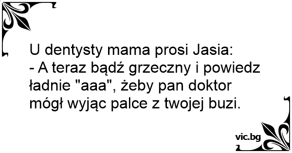 - A teraz bądź grzeczny i powiedz ładnie "aaa", żeby pan doktor mógł wyjąc palce z twojej buzi.