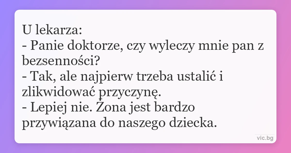 U lekarza:<br />- Panie doktorze, czy wyleczy mnie pan z bezsenności?<br />- Tak, ale najpierw trzeba ustalić i zlikwidować przyczynę.<br />- Lepiej nie. Żona jest bardzo przywiązana do naszego dziecka.