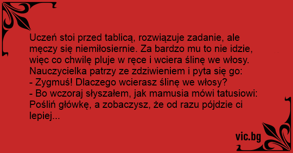 Uczeń stoi przed tablicą, rozwiązuje zadanie, ale męczy się niemiłosiernie. Za bardzo mu to nie idzie, więc co chwilę pluje w ręce i wciera ślinę we włosy. Nauczycielka patrzy ze zdziwieniem i pyta się go:
