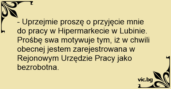 - Uprzejmie proszę o przyjęcie mnie do pracy w Hipermarkecie w Lubinie. Prośbę swa motywuje tym, iż w chwili obecnej jestem zarejestrowana w Rejonowym Urzędzie Pracy jako bezrobotna.
