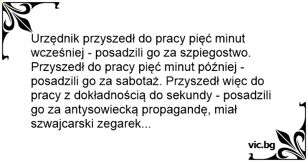 Urzędnik przyszedł do pracy pięć minut wcześniej - posadzili go za szpiegostwo. Przyszedł do pracy pięć minut później - posadzili go za sabotaż. Przyszedł więc do pracy z dokładnością do sekundy - posadzili go za antysowiecką propagandę, miał szwajcarski zegarek...