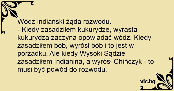 Indiánský náčelník žádá o rozvod. „Když zasadím kukuřici, vyroste kukuřice,” začne vzletně. „Když zasadím boby, vyrostou boby. Všechno je v pořádku. Ale když, slavný soude, zasadím Indiána a...