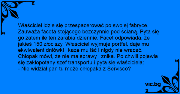 Właściciel idzie się przespacerować po swojej fabryce. Zauważa faceta stojącego bezczynnie pod ścianą. Pyta się go zatem ile ten zarabia dziennie. Facet odpowiada, że jakieś 150 złociszy. Właściciel wyjmuje portfel, daje mu ekwiwalent dniówki i każe mu iść i nigdy nie wracać. Chłopak mówi, że nie ma sprawy i znika. Po chwili pojawia się zakłopotany szef transportu i pyta się właściciela: