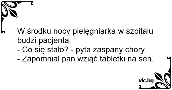 Seselė žadina pacientą, kuris tuo metu miega: - Paciente, kelkitės! Pacientas jos mieguistu balsu klausia: - Ko jums reikia? Seselė kuo ramiausiai atsako: - Aš jums atnešiau migdomųjų...