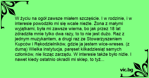 W życiu na ogół zawsze miałem szczęście. I w rodzinie, i w interesie powodziło mi się wcale nieźle. Żona z małymi wyjątkami, była mi zawsze wierna, bo jak przez 18 lat zdradziła mnie tylko dwa razy, to to nie jest dużo. Raz z jednym muzykantem, a drugi raz ze Stowarzyszeniem Kupców i Rękodzielników, gdzie ja jestem wice-wreses. (z dumą) Wielka instytucja, paręset kilkadziesiąt samych członków, nie licząc zarządu. W interesie także było niźle. I nawet kiedy ostatnio okradli mi sklep, to tyż miałem szczęście, bo akurat poprzedniego dnia obniżyłem ceny o 30%, więc nie tak dużo straciłem. Państwo muszą znać tę firmę na Nowolipkach: