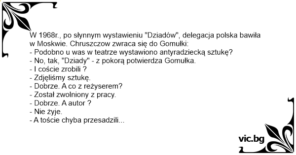 W 1968r., po słynnym wystawieniu "Dziadów", delegacja polska bawiła w Moskwie. Chruszczow zwraca się do Gomułki: