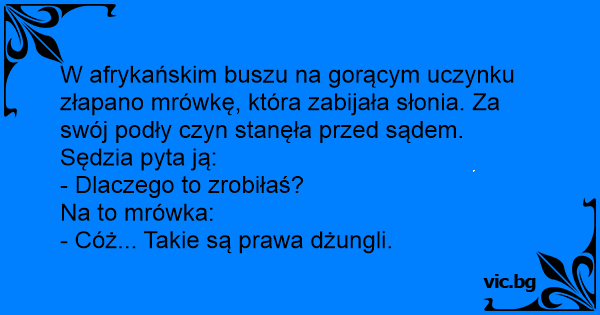 W afrykańskim buszu na gorącym uczynku złapano mrówkę, która zabijała słonia. Za swój podły czyn stanęła przed sądem. Sędzia pyta ją: