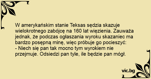 W amerykańskim stanie Teksas sędzia skazuje wielokrotnego zabójcę na 160 lat więzienia. Zauważa jednak, że podczas ogłaszania wyroku skazaniec ma bardzo posępną minę, więc próbuje go pocieszyć: