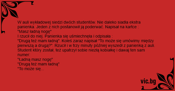 W auli wykładowej siedzi dwóch studentów. Nie daleko siadła ekstra panienka. Jeden z nich postanowił ją poderwać. Napisał na kartce :