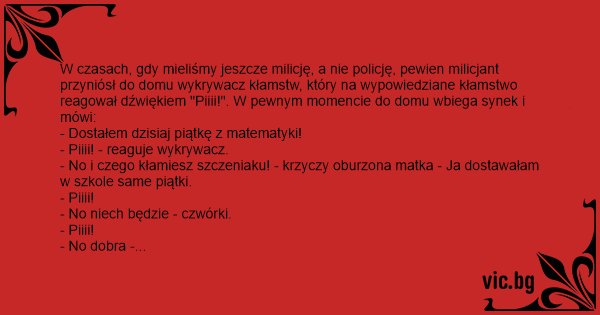 W czasach, gdy mieliśmy jeszcze milicję, a nie policję, pewien milicjant przyniósł do domu wykrywacz kłamstw, który na wypowiedziane kłamstwo reagował dźwiękiem "Piiii!". W pewnym momencie do domu wbiega synek i mówi:
