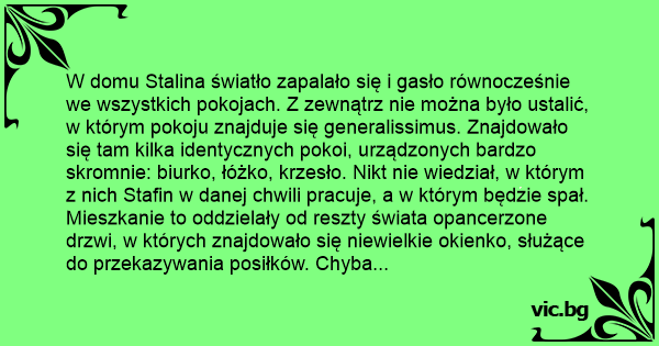 W domu Stalina światło zapalało się i gasło równocześnie we wszystkich pokojach. Z zewnątrz nie można było ustalić, w którym pokoju znajduje się generalissimus. Znajdowało się tam kilka identycznych pokoi, urządzonych bardzo skromnie: biurko, łóżko, krzesło. Nikt nie wiedział, w którym z nich Stafin w danej chwili pracuje, a w którym będzie spał. Mieszkanie to oddzielały od reszty świata opancerzone drzwi, w których znajdowało się niewielkie okienko, służące do przekazywania posiłków. Chyba żaden więzień na świecie nie znajdował się w takiej izolacji, jaką sam sobie narzucił Stalin.