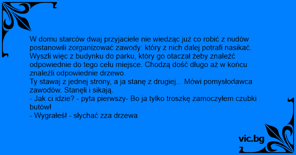 W domu starców dwaj przyjaciele nie wiedząc już co robić z nudów postanowili zorganizować zawody: który z nich dalej potrafi nasikać.
