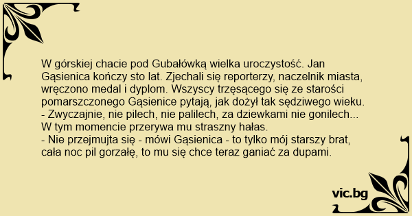 W górskiej chacie pod Gubałówką wielka uroczystość. Jan Gąsienica kończy sto lat. Zjechali się reporterzy, naczelnik miasta, wręczono medal i dyplom. Wszyscy trzęsącego się ze starości pomarszczonego Gąsienice pytają, jak dożył tak sędziwego wieku.