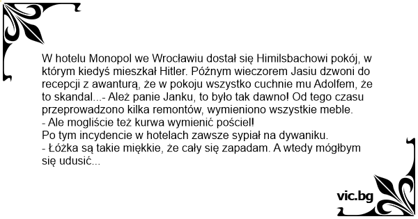 W hotelu Monopol we Wrocławiu dostał się Himilsbachowi pokój, w którym kiedyś mieszkał Нiтlеr. Późnym wieczorem Jasiu dzwoni do recepcji z awanturą, że w pokoju wszystko cuchnie mu Adolfem, że to skandal...- Ależ panie Janku, to było tak dawno! Od tego czasu przeprowadzono kilka remontów, wymieniono wszystkie meble.