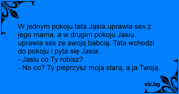 W jednym pokoju tata Jasia uprawia sеx z jego mama, a w drugim pokoju Jasiu uprawia sеx ze swoją babcią. Tata wchodzi do pokoju i pyta się Jasia: