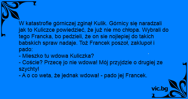 W katastrofie górniczej zginął Kulik. Górnicy się naradzali jak to Kuliczce powiedzieć, że już nie mo chłopa. Wybrali do tego Francka, bo pedzieli, że on sie nojlepiej do takich babskich spraw nadaje. Toż Francek poszoł, zaklupoł i pado: