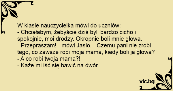 - Przepraszam! - mówi Jasio. - Czemu pani nie zrobi tego, co zawsze robi moja mama, kiedy boli ją głowa?