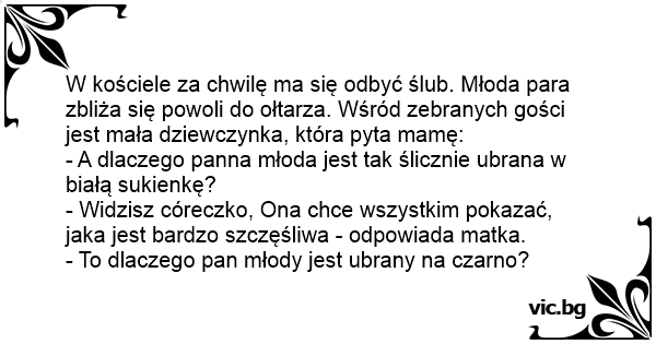 Мамо, мамо, а зошто… Wedding Dress Το νυφικό Момченце държи снимка на младоженци и разпитва майка си: Απορίες ενός μικρού κοριτσιού Защо в деня на сватбата булката е облечена в бяло? A little boy looks at his mum at a wedding and says, “Mummy, why is the girl dressed all in white?” Una bimba assiste per la prima volta a un matrimonio: a un certo punto chiede alla madre: El niño Bernardino asiste a su primera boda – Al cabo de un rato, le pregunta a su mama: – Mamá, mamá, ¿por qué la novia va vestida de blanco? – Pues… porque este es el día más feliz de su vida. – Ah… y dime, ¿porque el novio va vestido de negro? Na ślubie Jaś pyta się taty: - Tato, dlaczego ta pani jest ubrana na biało? - Bo jest szczęśliwa, synku. - Tatusiu, a dlaczego ten pan jest ubrany na czarno? Toto passe devant une église avec sa maman, voyant sortir des jeunes mariés, il demande : - Maman, pourquoi la mariée est-elle en blanc ? - Parce que c'est le plus beau jour de sa vie ! - Et le monsieur alors, pourquoi est-il en noir ? No meio de uma cerimônia de casamento, Joãozinho pergunta: — Mamãe! Por que toda noiva se veste de branco? — Porque é o dia mais feliz da vida dela! — responde a mãe. — Entendi... E por que o noivo... Öğretmen derste şunları anlatıyordu: - Düğünlerde gelinler neden beyaz giyer bilir misiniz? Bu onların en mutlu günü olduğu için! Arka sıralardan bir ses yükselir; - Damatların neden siyah elbise... A little boy, at a wedding looks at his mom and says, “Mommy, why does the girl wear white?” His mom replies, “The bride is in white because she’s happy and this is the happiest day of her life.”... Juhani oli äidin kanssa häissä. Vihkiseremonian jälkeen hän kysyi: Äiti, miksi tädillä on valkea mekko? Koska hän on niin iloinen tänään, äiti vastasi. Juhani mietiskeli hetken ja kysyi sitten:... A családi fényképalbumban Móricka a szülei esküvői képet nézegeti. - Anyu, miért voltál fehér ruhában? - Azért, mert a fehér az öröm és a boldogság színe. - Akkor már értem, hogy az apu miért van... Anne küçük kızına anlatıyordu. "Bak kızım, gelinler en mutlu günleri olduğu için nikahta beyaz giyerler." Küçük kız bir an düşündü. "Yaa... Şimdi damatların neden siyah giydiklerini daha iyi... Estaba una señora con su hijito de cinco años en la boda de su sobrina cuando el niño levanta la cabeza y le pregunta: Mami, mami, ¿Por qué la novia esta vestida toda de blanco? A lo que la mamá le... - Mamico, de ce poarta miresele rochii albe? - Fiindca exprima bucuria. - Atunci, mirele de ce-i imbracat in negru? Una bambina alla madre nel giorno di un matrimonio: "Mamma perchè la sposa ha il vestito bianco?" E la mamma: "Perchè questo è un giorno felice e importante!" E la bambina: "E perchè lo sposo è... Lilla Elsa är på bröllop för första gången i sitt liv och frågar sin mamma varför bruden är klädd i vitt. - Jo, förstår du lilla Elsa, det är för att det är den lyckligaste dagen i hennes liv. Elsa... - Mamá, ¿por qué las mujeres se visten de blanco en las bodas? - Porque es el día más feliz de su vida. - Ah, ya se porque los hombres se visten de negro. Un enfant et sa mère passent devant une église. Un mariage s'y passe. L'enfant demande à sa mère: - Maman, pourquoi la mariée est habillée en blanc ? - Car le blanc symbolise la joie et c'est le... - Mamo, dlaczego na zdjęciu ślubnym jesteś w białym welonie?- zapytał Jasiu. - Biały kolor to znak radości, synku. - A dlaczego tata jest ubrany na czarno? - Mor? Hvorfor har bruden en hvit kjole på? Moren: - Fordi hvitt symboliserer lykke, og bryllupsdagen er den lykkeligste dagen i hennes liv. Piken: - Jammen, hvorfor har brudgommen da sort på? Мамо, ги гледав сликите од вашата свадба со тато и сакам да те прашам зошто носиш бел фустан? Мајката: Зошто белата боја е боја на радоста. Детето: А тогаш зошто тато е во црно?! 1 mère et 1 fils parle: Fils: Maman pourquoi la mariée porte une robe blanche le jour du mariage? Mère: Car c'est le plus beau jour de sa vie. Fils: Alors pourquoi le marié est habillé en noir? Toto et ses parents assistent à un mariage. Toto demande à sa maman : - Pourquoi la mariée à une robe blanche ? - Car c’est le jour le plus magnifique de sa vie, répond sa mère. - Alors pourquoi le... *boy whispers to his mom during a wedding* Boy: "Mommy?" Mom: "What?" Boy: "Why is the girl dressed in white?" Mom: "Because this is the happiest day of her life." Boy: "... so why is the boy... Attending a wedding for the first time, a little girl whispered to her mother, "why is the bride dressed in white?" "Because white is the color of happiness," her mother explained. "And today is... Mergaičiukė pirmą kartą vestuvėse: - Mama, o kodėl šita…jaunoji… visa baltai apsirengusi? - Todėl, kad šiandien pati džiugiausia diena jos gyvenime. Po pauzės: - Mama, o kodėl jaunasis apsirengęs...