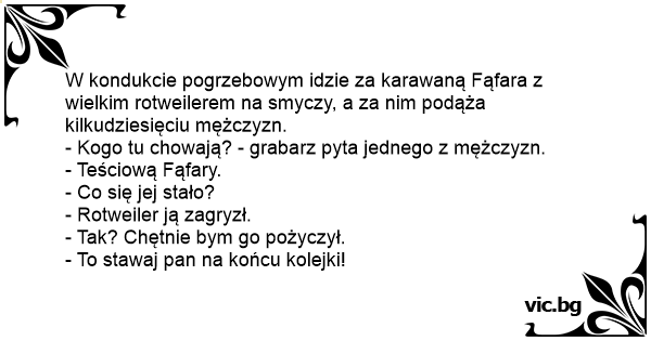 Chiste del hombre y el feretro lange Schlange Погребална процесия. Млада жена излиза от магазина и изжеднъж вижда странна погребална процесия Ένας άνδρας έβγαινε από μια καφετέρια με τον πρωινό καφέ του, όταν παρατήρησε μια εντελώς ασυνήθιστη τελετή κηδείας προς το κοντινό νεκροταφείο. Someone going to work sees a crowd of people walking. Looking at the beginning of course, he sees a coffin behind a gentleman with a little dog followed by the crowd. Approaching the owner and he asks him: Tom was walking down the street when he sees a funeral procession. Un uomo curioso vede un funerale e si ferma ad osservare la funzione. Nota subito che a capo di una lunga fila di uomini c'è un signore con un cane e gli si avvicina domandandogli: "Scusi, mi saprebbe dire chi è morto?" "Mia moglie, è stato questo cane a sbranarla!" "Davvero? Non è che me lo... Saindo do supermercado um homem se depara com uma inusitada procissão de funeral. Achou aquilo muito estranho e parou para olhar. Primeiro vinha um caixão preto. Depois, um segundo caixão preto. Em seguida, um homem sozinho, levando um doberman na coleira. Finalmente, atrás dele, uma longa fila... En una ocasión había muchas personas reunidas en una casa y pasó por allí un conocido de la familia y preguntó: - ¿Qué pasó compadre? ¿Murió alguien? - Sí, mi burro mató a mi suegra de una patada. - ¿Y toda esa gente conocía a tu suegra? - No... ¡Vinieron a comprar el burro! Une femme regarde un cortège funèbre inhabituel arrivant au cimetière tout proche: un corbillard, suivi d’un second corbillard avec, derrière, une femme seule avec un pit-bull en laisse. Quelques pas derrière elle, environ 200 femmes marchaient en file indienne. Ne contenant pas sa curiosité, la... Destrás de una carrosa funebre iba una fila de 4 cuadras. Un borracho admirado se acerca y pregunta: ¿Quién murió? y un hombre le responde. -Mi suegra!!, y el borracho entonces pregunta: -Y ¿De que murió? -Le dicen: La mató un perro. El borracho dice: ¿Me puedes prestar al perro? Y toda la gente... Fıkra bu ya, bir adam sabah yürürken ilginç bir cenaze kafilesi fark eder; önde giden köpekli bir adam, arkasında …iki tabut ve tek sıra olmuş yaklaşık 200 adam. Tuhafına gider. Kafilenin başındaki... Bij een begrafenis loopt achter de lijkwagen een man met een hond. Daarachter lopen nog 500 mannen. Vraagt een toeschouwer aan man met de hond: "Wie wordt hier begraven?" "Mijn schoonmoeder"... Mies näki kadulla merkillisen hautajaissaattueen. Siihen kuului ruumisarkku, mustiin pukeutunut mies joka piteli ketjussa valtavaa susikoiraa sekä miehen jäljessä astelevat parikymmentä muuta... U hřbitovní brány hledí muž na podivný průvod. Za rakví kráčí muž s manželkou a psem dobrmanem, a potom dlouhá řada mužů. Stojící nevydrží a ptá se, kdo to má pohřeb. Pán za rakví odvětí: „To je... 0  Loading ... Kapinėse eina laidotuvių procesija. Paskui grabą eina ožys, o už jo daugybė žmonių. Vienas praeivis susidomėjo ir priėjęs prie procesijos klausia: - Kas numirė? Vienas vyras, juodu... Trece pe strada un cortegiu funerar foarte ciudat: dupa dric urma un tip, un caine fioros si, la mare distanta vreo cincizeci de oameni. Un tip se apropie si intreaba: - Cine a murit ? -... Um sujeito, ia andando pela rua, e viu um cortejo fúnebre. Logo uma coisa chamou a sua atenção, atras do caixão, só iam homens e um cachorro. Ele foi até o que estava levando o cachorro, e... Bengan turistade i New Orleans. En dag fick han se ett begravningsfölje. Först gick en orkester, och direkt efter kistan gick en man med en leopard i koppel bredvid en djupt sorgklädd kvinna.... Bir adam yolda yürürken çok uzun bir sıra görmüş. Iyice yürüyünce sıranın başında bir cenaze ve elinde köpek olan bir adam görmüş ve sormuş:rahmetli çok seviliyordu galiba!adam anlatmaya... Em um cemiterio ocorria um velório. E lá estava um cara com um cachorro pitbul com uma fila enorme atrás, e dois caichões. No buteco do lado ,um homen viu que estava algo errado e por curiosidade... Otegao se grdan desetokilometarski sprovod ulicom. Za mrtvačkom kočijom ide lik i vodi mačku na uzici. Narod stoji sa strane, čude se i komentarišu: ko li je to umro te je toliko sveta došlo na... Une femme observe un cortège funéraire bizarre : un grand corbillard noir, suivi d'un autre corbillard avec, juste derrière, une femme seule avec un gros chien en laisse et juste derrière des... Un barbat lua micul dejun la ora 8 dimineata, un sandvis si o cafea, cand vede trecand pe strada o procesiune de inmormantare foarte neobisnuita. Un sicriu negru mare era urmat la cativa pasi de un... Į kapines eina nežmoniško ilgio procesija, kokie 15 tūkstančių žmonių, o procesijos priekyje, prieš pat karstą – didžiulis ilgaragis ožys. Praeivis, nustębęs procesijos keistumu, prieina prie vieno...