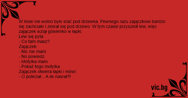 W lesie nie wolno było srаć pod drzewka. Pewnego razu zajączkowi bardzo się zachciało i zesrał się pod drzewo. W tym czasie przyszedł lew, więc zajączek wziął gówienko w łapki.
