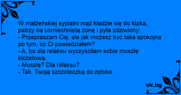 Żona do męża: - Kiedy się na ciebie złoszczę, nigdy nie odpowiadasz mi tym samym. Jak udaje ci się kontrolować złość? - Czyszczę sedes... - I to ci pomaga? - Używam twojej szczoteczki do zębów...