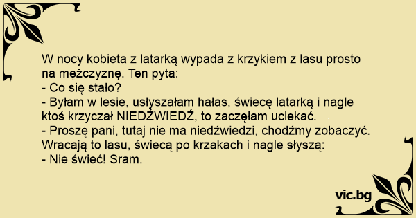 W nocy kobieta z latarką wypada z krzykiem z lasu prosto na mężczyznę. Ten pyta: