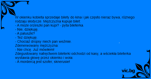 Zdegustowany natręctwem bileterki odchodzi od kasy, a wściekła bileterka wystawia głowę przez okienko i woła: