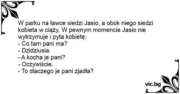 Jasiu siedzi na ławce a obok jego kobieta w ciąży Jasiu nie wytrzymuje i pyta Jasiu: co tam pani ma? Kobieta: dzidiusia Jasiu: a kocha go pani? Kobieta: oczywiście Jasiu: to czemu pani go zjadła
