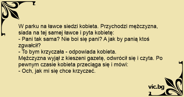W parku na ławce siedzi kobieta. Przychodzi mężczyzna, siada na tej samej ławce i pyta kobietę: