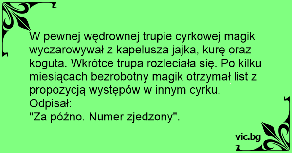W pewnej wędrownej trupie cyrkowej magik wyczarowywał z kapelusza jajka, kurę oraz koguta. Wkrótce trupa rozleciała się. Po kilku miesiącach bezrobotny magik otrzymał list z propozycją występów w innym cyrku. Odpisał: