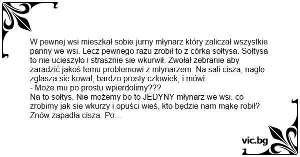 W pewnej wsi mieszkał sobie jurny młynarz który zaliczał wszystkie panny we wsi. Lecz pewnego razu zrobił to z córką sołtysa. Sołtysa to nie ucieszyło i strasznie sie wkurwił. Zwołał zebranie aby zaradzić jakoś temu problemowi z młynarzem. Na sali cisza, nagle zgłasza sie kowal, bardzo prosty człowiek, i mówi: