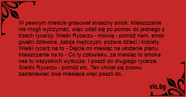 W pewnym mieście grasował straszny smok. Mieszczanie nie mogli wytrzymać, więc udali się po pomoc do jednego z trzech rycerzy. Wielki Rycerzu - mówią - pomóż nam, smok gwałci dziewice, zabija mężczyzn, pożera dzieci i kobiety. Wielki rycerz na to - Dajcie mi miesiąc na ułożenie planu. Mieszczanie na to - Co ty człowieku, za miesiąc to smoka nas tu wszystkich wytłucze. I poszli do drugiego rycerza. Średni Rycerzu - pomóż etc. Ten chciał się znowu zastanawiać dwa miesiące więc poszli do trzeciego rycerza. Mały Rycerzu - pomóż etc. Na to Mały Rycerz łap za miecz, zakłada zbroję, objucza konia i już jest gotowy do drogi. Pytają więc mieszczanie. Jak to czcigodny Mały Rycerzu, Wielki Rycerz chciał się zastanawiać miesiąc, Średni Rycerz dwa miesiące, a Ty tak od razu?! Na to Mały Rycerz.