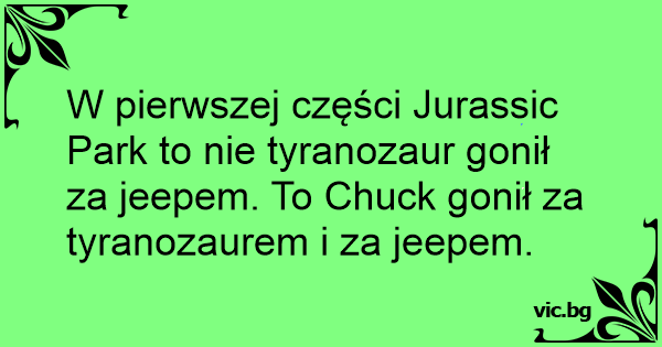 W pierwszej części Jurassic Park to nie tyranozaur gonił za jeepem. To Chuck gonił za tyranozaurem i za jeepem.