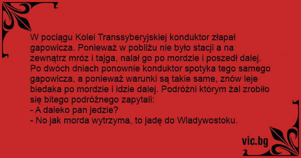 W pociągu Kolei Transsyberyjskiej konduktor złapał gapowicza. Ponieważ w pobliżu nie było stacji a na zewnątrz mróz i tajga, nalał go po mordzie i poszedł dalej. Po dwóch dniach ponownie konduktor spotyka tego samego gapowicza, a ponieważ warunki są takie same, znów leje biedaka po mordzie i idzie dalej. Podróżni którym żal zrobiło się bitego podróżnego zapytali: