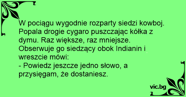 W pociągu wygodnie rozparty siedzi kowboj. Popala drogie cygaro puszczając kółka z dymu. Raz większe, raz mniejsze. Obserwuje go siedzący obok Indianin i wreszcie mówi: