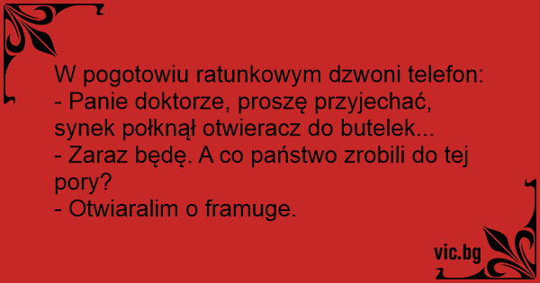 - Panie doktorze, proszę przyjechać, synek połknął otwieracz do butelek...