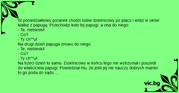 Na trzeci dzień to samo. Dzielnicowy w końcu tego nie wytrzymał i poszedł do właściciela papugi. Powiedział mu, że jeśli jej nie nauczy dobrych manier to go poda do sądu.