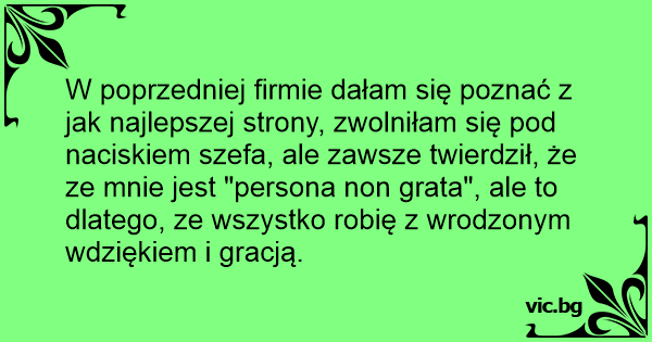 W poprzedniej firmie dałam się poznać z jak najlepszej strony, zwolniłam się pod naciskiem szefa, ale zawsze twierdził, że ze mnie jest "persona non grata", ale to dlatego, ze wszystko robię z wrodzonym wdziękiem i gracją.