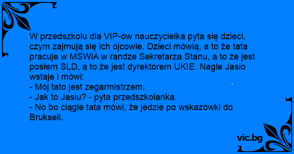 W przedszkolu dla VIP-ów nauczycielka pyta się dzieci, czym zajmują się ich ojcowie. Dzieci mówią, a to że tata pracuje w MSWiA w randze Sekretarza Stanu, a to że jest posłem SLD, a to że jest dyrektorem UKIE. Nagle Jasio wstaje i mówi: