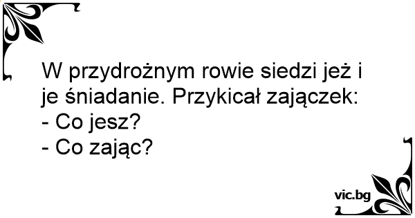 W przydrożnym rowie siedzi jeż i je śniadanie. Przykicał zajączek: