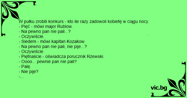 W pułku zrobili konkurs - kto ile razy zadowoli kobietę w ciągu nocy.
