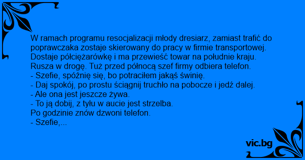 - Szefie, dobiłem świnię skopałem truchło na pobocze, ale nie mogę wyciągnąć roweru z pod auta.