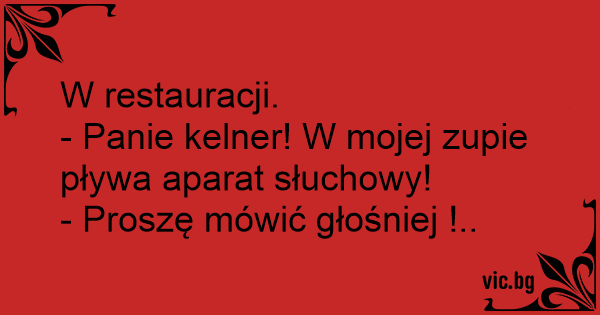 Келнер в супата ми плува слухово апаратче! - Келнер, в супата ми плува слухов апарат! Ein Gast zum Ober: Der Gast zum Ober: "Da schwimmt ein Hörgerät in meiner Suppe!" Ober: "Wie bitte?" "Herr Ober - in meiner Suppe schwimmt ein Hörgerät." "Wie meinen?" - Kelner, det er et høreapparat i suppen min! - Hæ, hva sier du...... "Tjener, der er et høreapparat i min suppe!" "Hva´?" – Hovmästarn! Det är en hörapparat i soppan! – VA?? - Kelner, w mojej zupie pływa aparat słuchowy! Kelner!! Keeelneeeeeer!!! – Ursäkta, det är en hörapparat i min soppa?! – VAAAAAA???” Een man heeft in een restaurant soep besteld. Toen de ober de soep op tafel had gezet, zei de man: Er drijft een hoorapparaatje in mijn soep. Zei de ober: Wat zegt u? - Hé, pincér! Egy hallókészülék van a levesemben! - Mit mond, uram? Tjener forfanden, der ligger et ulnkert høreapparat midt i min suppe? -  Hva?!