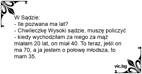 - Chwileczkę Wysoki sądzie, muszę policzyć - kiedy wychodziłam za niego za mąż miałam 20 lat, on miał 40. To teraz, jeśli on ma 70, a ja jestem o połowę młodsza, to mam 35.
